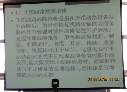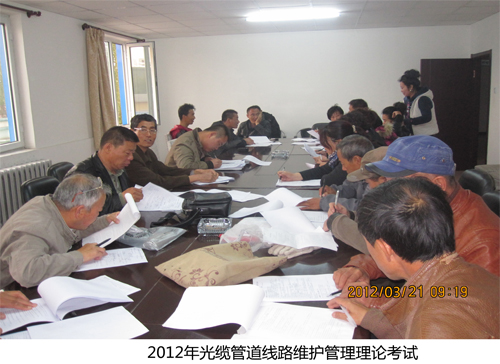2012年3月公司組織所有維護(hù)人員進(jìn)行理論、技術(shù)、管理、素質(zhì)等綜合培訓(xùn),外聘專業(yè)指導(dǎo)老師現(xiàn)場進(jìn)行《光纜線路代維管理培訓(xùn)》,并現(xiàn)場進(jìn)行光纜接續(xù)演練及理論知識(shí)考試。通過本次業(yè)務(wù)培訓(xùn),提高了維護(hù)人員的理論管理水平,增強(qiáng)了技術(shù)人員搶修能力,為努力打造一支過硬的維護(hù)團(tuán)隊(duì)奠定了基礎(chǔ)。