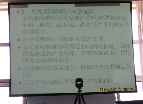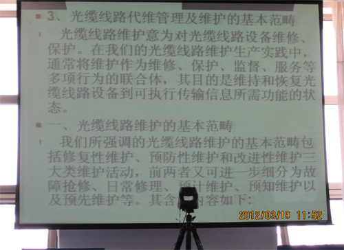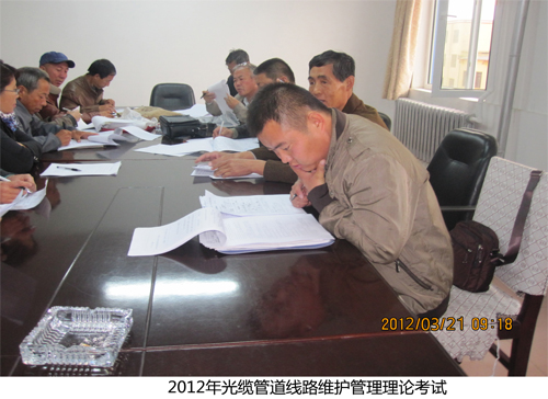2012年3月公司組織所有維護(hù)人員進(jìn)行理論、技術(shù)、管理、素質(zhì)等綜合培訓(xùn),外聘專業(yè)指導(dǎo)老師現(xiàn)場進(jìn)行《光纜線路代維管理培訓(xùn)》,并現(xiàn)場進(jìn)行光纜接續(xù)演練及理論知識(shí)考試。通過本次業(yè)務(wù)培訓(xùn),提高了維護(hù)人員的理論管理水平,增強(qiáng)了技術(shù)人員搶修能力,為努力打造一支過硬的維護(hù)團(tuán)隊(duì)奠定了基礎(chǔ)。